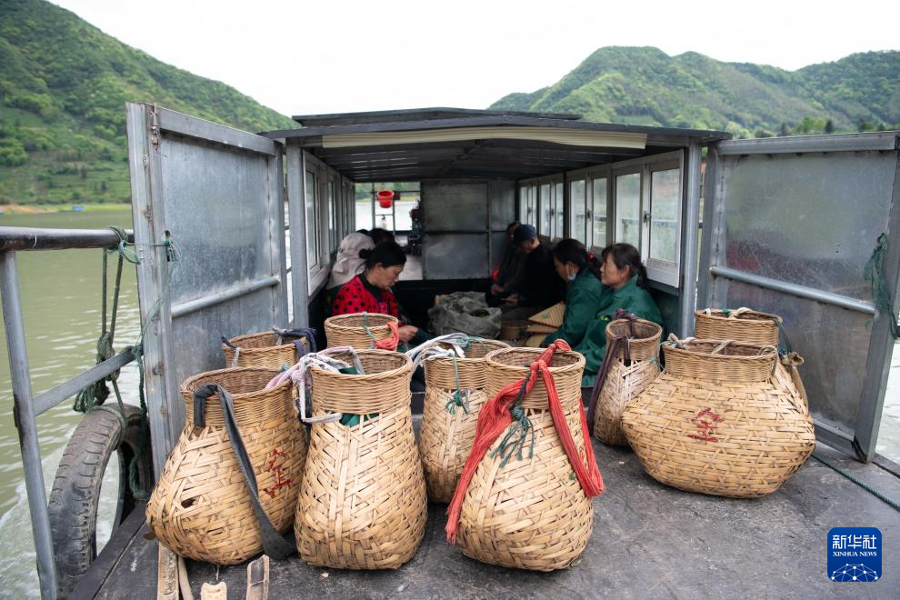 4月24日中午,采茶工乘船返回黄山市黄山区新明乡猴坑村中潭村民组。