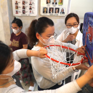 4月19日,在印度尼西亚雅加达,石凯欣(右二)和志愿者组装向当地儿童癌症中心捐赠的体育器材。