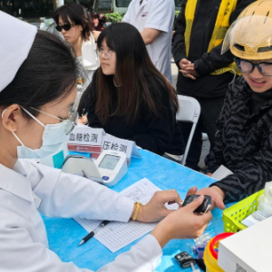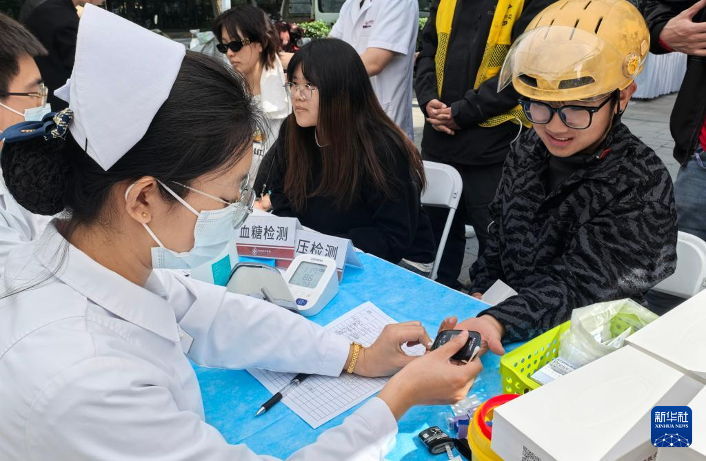 4月28日,志愿者在为快递员测量血糖。