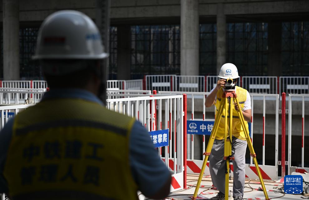 4月28日,中铁建工作业人员在深汕站内部测量作业。