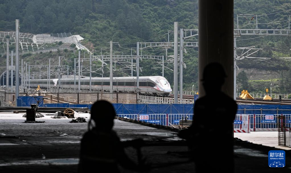 4月28日,列车经过建设中的深汕站(无人机照片)。