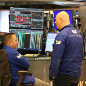 4月27日,交易员在美国纽约证券交易所交易大厅内交谈。