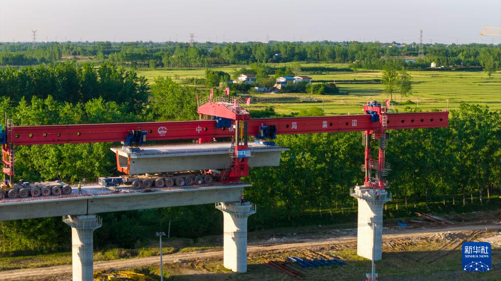 4月30日,中铁十局工人在合武高铁安徽段站前一标箱梁架设现场作业(无人机照片)。