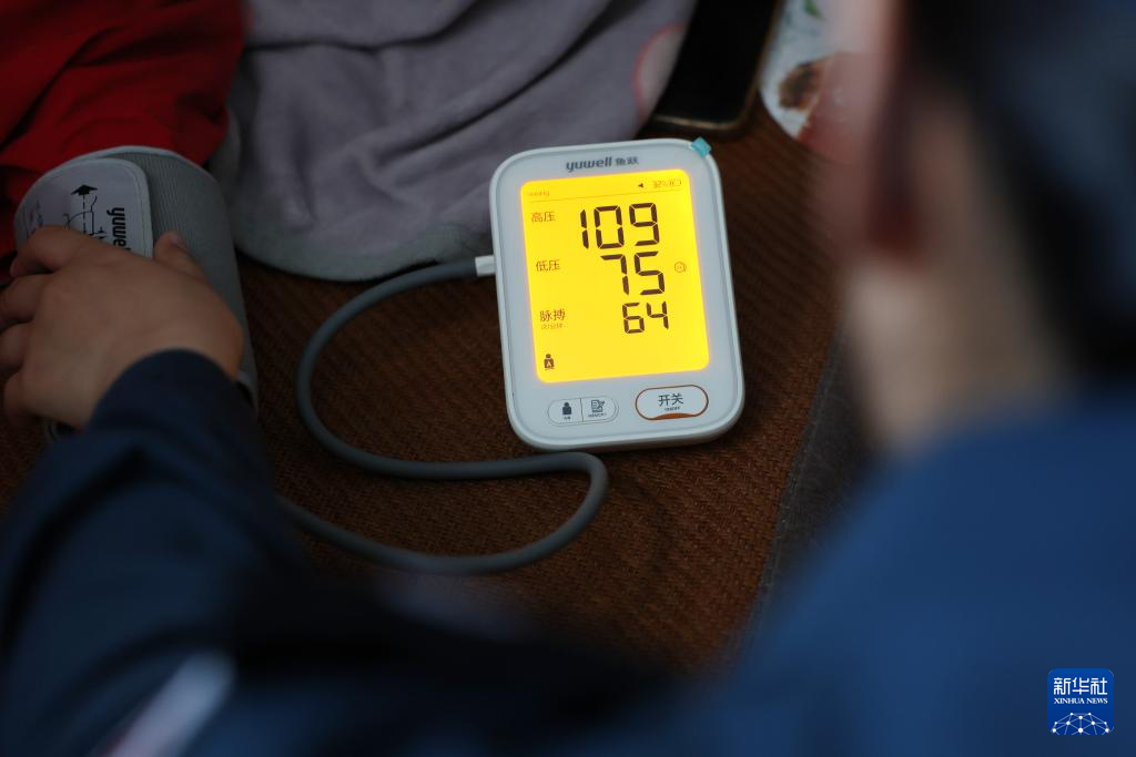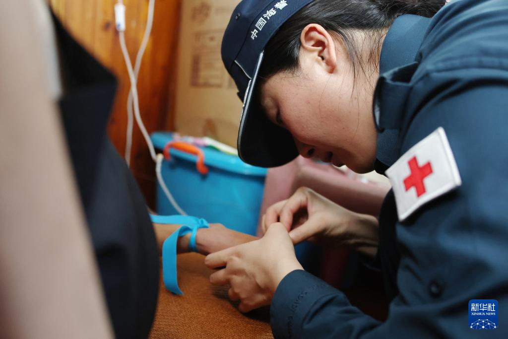 海警川山舰随舰医生李宜佳在渔船上为患病渔民量血压(4月26日摄)。新华社记者 陈斌 摄pagebreak