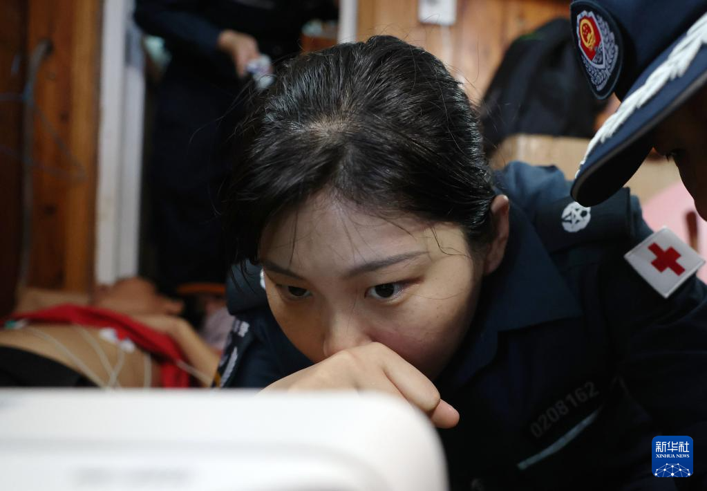 海警川山舰随舰医生李宜佳在渔船上为患病渔民做心电监护(4月26日摄)。新华社记者 陈斌 摄pagebreak