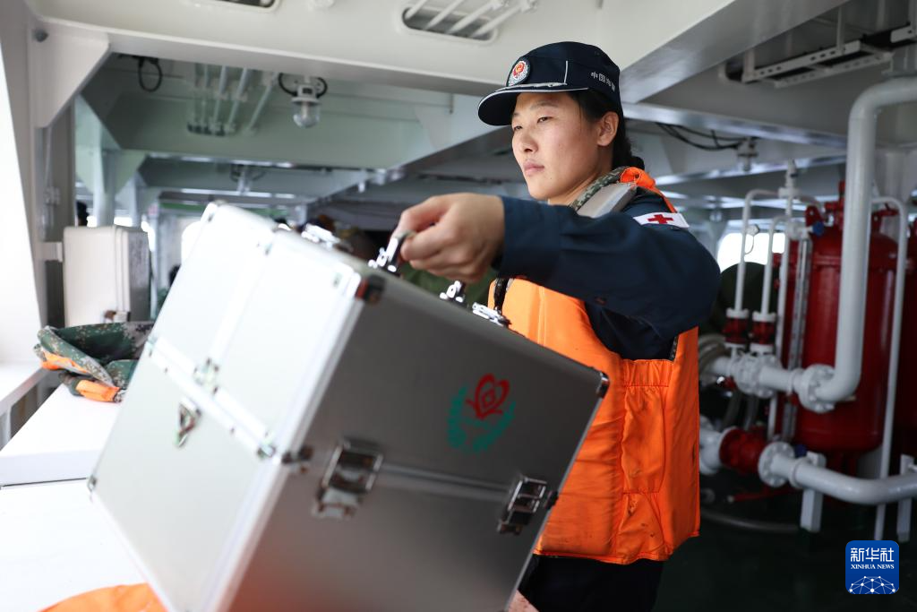 海警川山舰卫生员单荣荣拎起急救箱准备乘小艇前往渔船救治患病渔民(4月26日摄)。新华社记者 陈斌 摄pagebreak