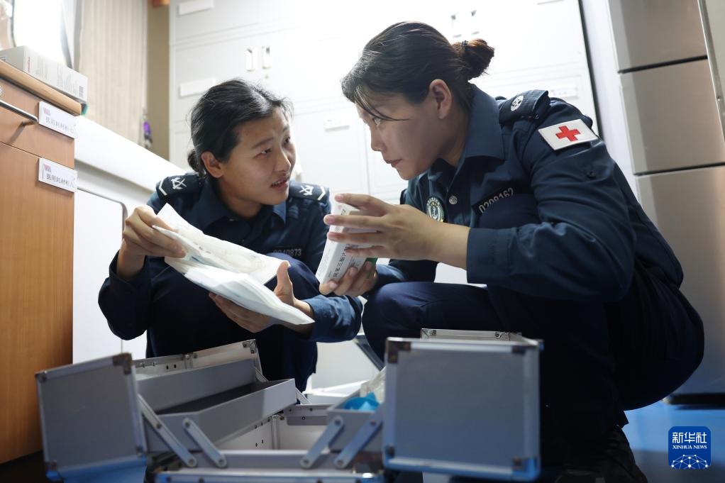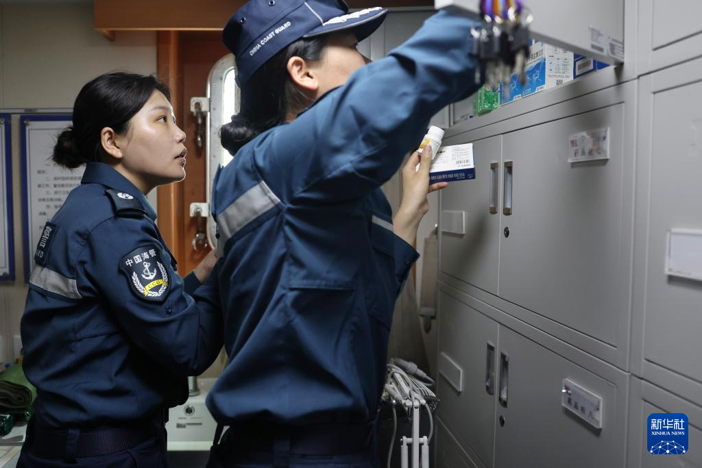 海警川山舰随舰医生李宜佳(左)和卫生员单荣荣在医务室整理急救药品,准备前往渔船救治患病渔民(4月26日摄)。新华社记者 陈斌 摄pagebreak