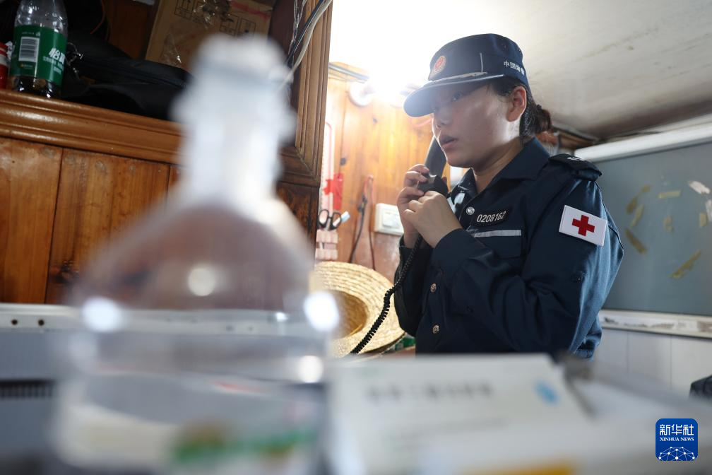 海警川山舰随舰医生李宜佳在渔船上向上级医院汇报患者病情并开展远程会诊(4月26日摄)。新华社记者 陈斌 摄