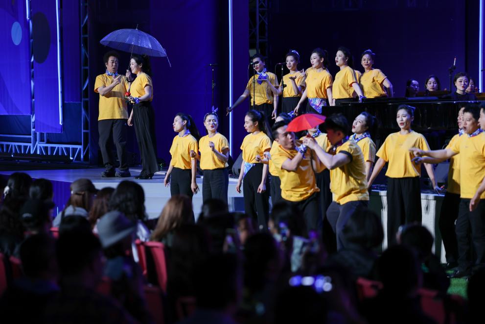 4月30日,在开幕式暨爵士乐日音乐会上,国家大剧院合唱团在表演《雨中即景》。