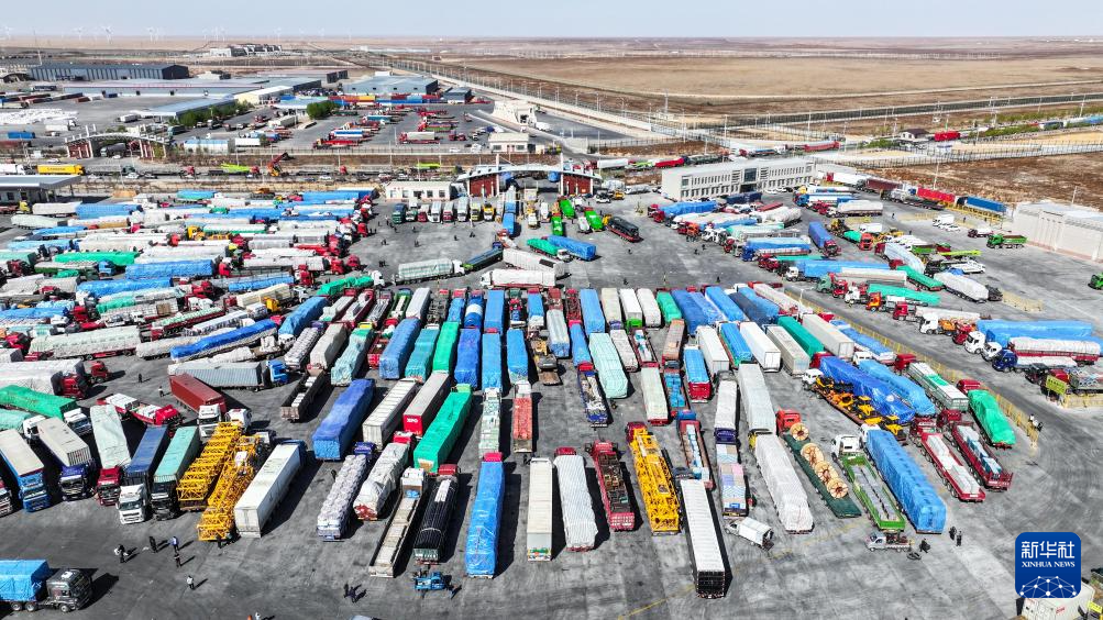 4月30日拍摄的二连浩特公路口岸物流园区内等待通关的货运车辆(无人机照片)。