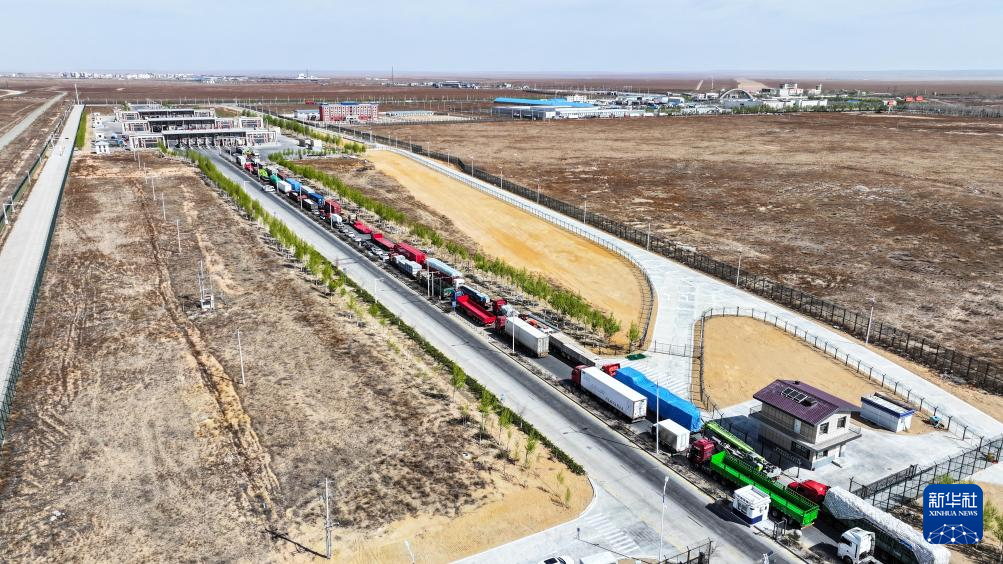 4月30日,二连浩特公路口岸货运车辆有序排队通关(无人机照片)。