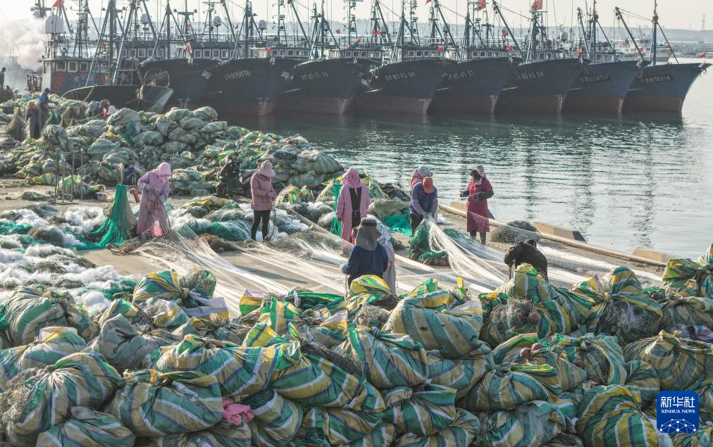4月30日,在山东省荣成市石岛管理区一处渔港,出海作业渔船陆续返港靠岸,渔民整理渔具准备入库(无人机照片)。