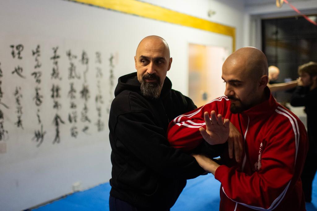 11月13日,在德国柏林“玄”武术馆,游理汉(左)指导学员练习。