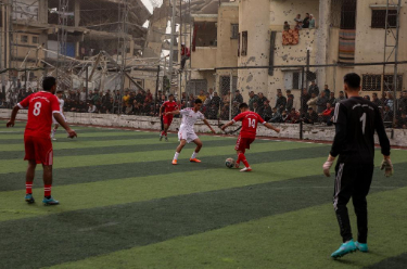 2月14日,在加沙城南部,当地民众在被摧毁的建筑废墟附近参加一场足球赛。