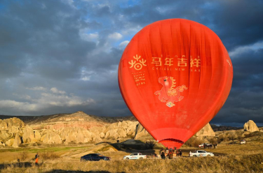 2月14日,在土耳其卡帕多基亚中国春节庆祝活动现场,中国马年主题的热气球正在充气。