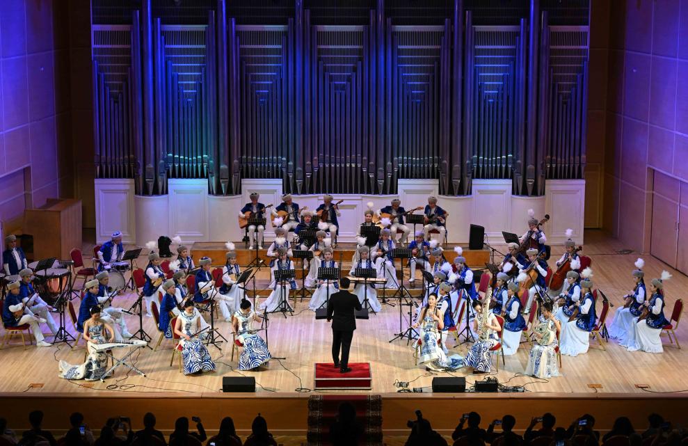3月5日,在位于阿拉木图的哈萨克斯坦国立江布尔音乐厅,“青花瓷”民乐团和哈萨克斯坦特连迪耶夫模范民族乐团同台演奏。