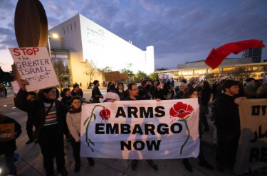 3月7日,人们在特拉维夫的一处广场举行集会,抗议以色列的军事行动,要求以色列停止战争行为。