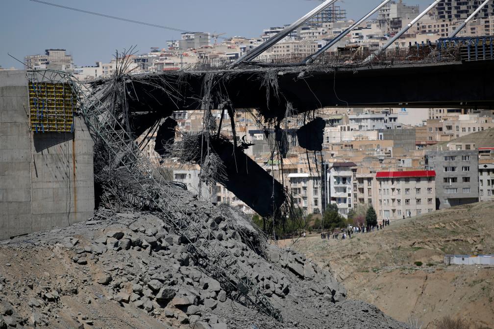 这是4月3日拍摄的伊朗卡拉季市贝伊克公路桥遭空袭受损状况。