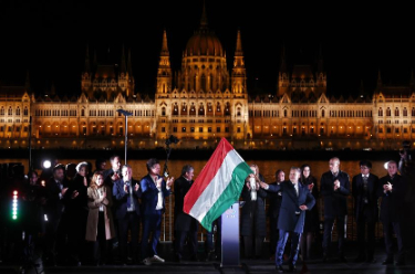 4月12日,在匈牙利首都布达佩斯,匈牙利蒂萨党领导人毛焦尔·彼得(前右)在胜选晚会上挥舞匈牙利国旗。