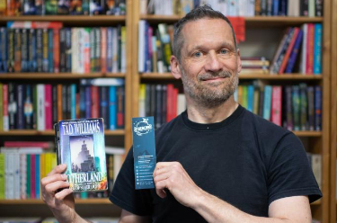 4月16日,在德国柏林,异境书店合伙人之一沃尔夫冈·特雷斯手持书店名称来源的书籍。