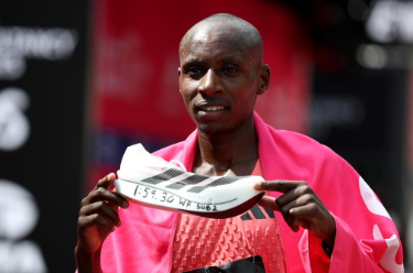 4月23日,在塞拉利昂西部地区布莱克·约翰逊村,塞拉利昂总统比奥(左二)在中国援建的塞拉利昂渔码头项目海上工程启动仪式上参观项目沙盘模型。