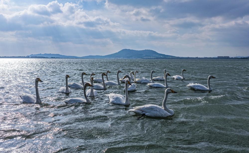 10月18日,山东省荣成市大天鹅国家级自然保护区天鹅湖畔迎来首批越冬大天鹅。