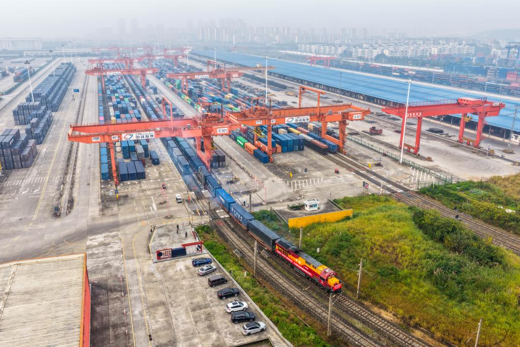 11月30日,重庆—匈牙利布达佩斯全程时刻表中欧班列在重庆团结村中心站顺利发车(无人机照片)。