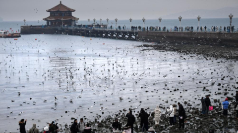 冬日,众多海鸥聚集在青岛栈桥景区飞舞、觅食,成为当地冬季旅游的标志性景观。
