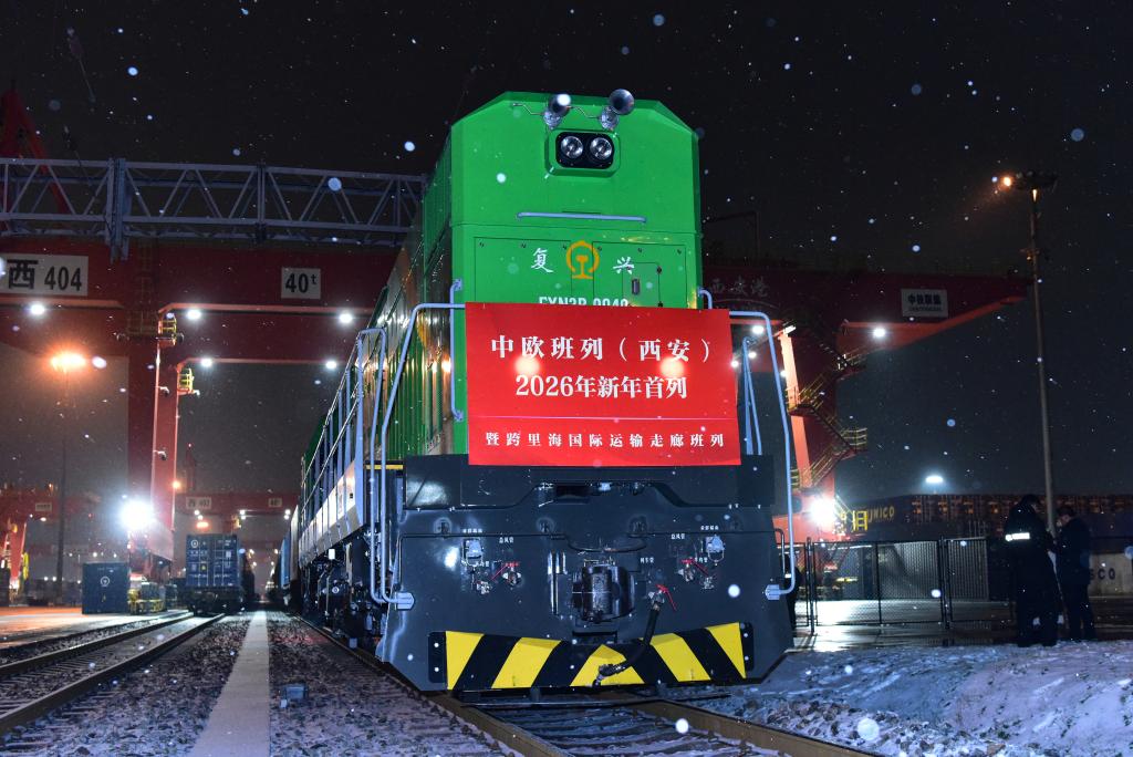 2025年12月31日夜,中欧班列(西安)2026年新年首列暨跨里海国际运输走廊班列在西安国际港站等待发车。