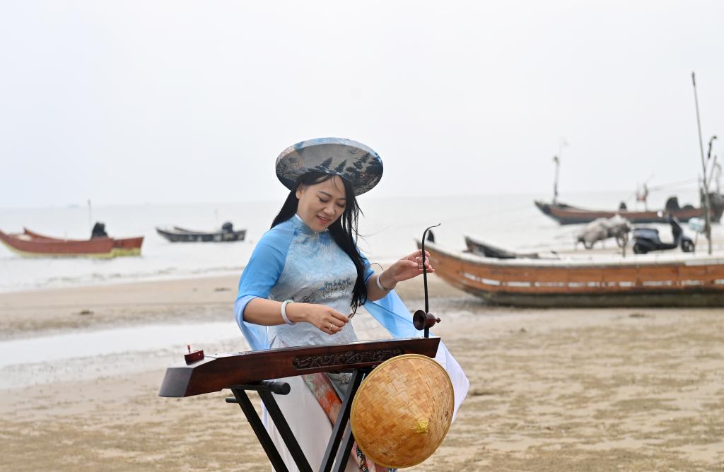“南风吹拂,隔山又隔海,船夫划桨手已累,好酒未饮已先醉……”在广西东兴市金滩上,苏海珍右手拨动琴弦,左手推拉摇杆,《问月歌》悠扬婉转的旋律飘荡在海边,展现着京族独弦琴独有的艺术魅力。