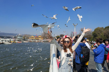 除夕当天,许多游客和市民来到云南省昆明市海埂大坝,观赏越冬的红嘴鸥。