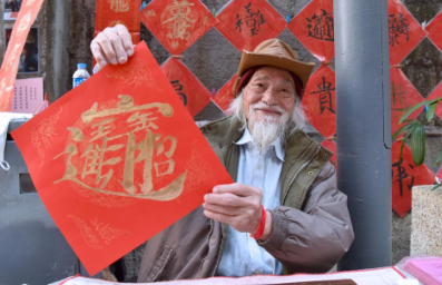 2月13日,在香港楼梯街,郭腾龙展示自创的合体字挥春。