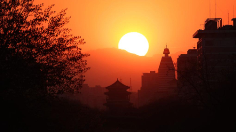 这是3月18日在北京明城墙遗址公园拍摄的夕阳风景。