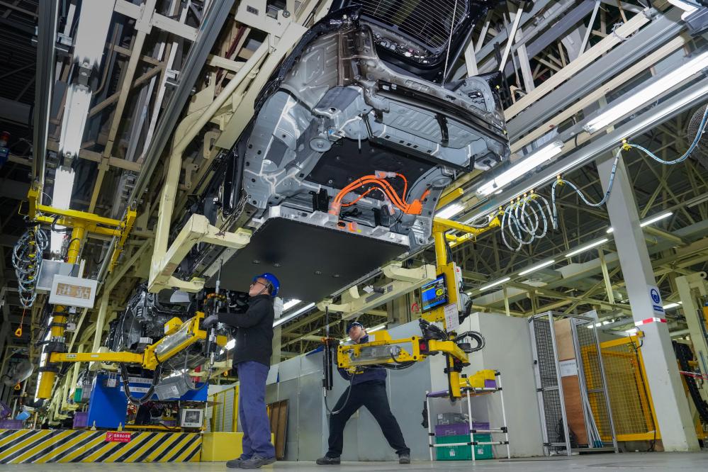 3月17日,在位于南京市江宁开发区的长安马自达汽车有限公司总装车间内,工人在生产线上进行生产作业。