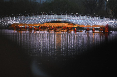 3月22日,在北京市朝阳区亮马河水碓桥附近的水域上,来自广西阳朔的民俗项目“金龙巡游”精彩上演,众多竹筏首尾相连,宛若金色长龙,点亮春夜。