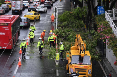 3月30日,在广州市越秀区解放中路,工作人员在清理倒伏树木。