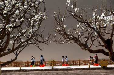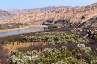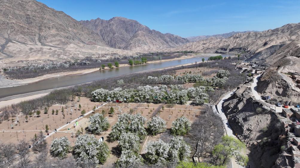春日的宁夏中卫市南长滩村,黄河水蜿蜒流淌,岸边绿芽初绽,村里梨花竞相开放,勾勒出一幅生机盎然的黄河春景图。