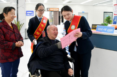 4月9日,在江苏淮安经济技术开发区政务服务中心“三联办”服务专区,一名经营者(左)领取变更后的营业执照。