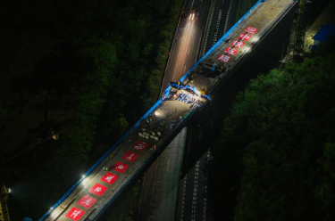 4月13日凌晨,在邵永高铁刘家院子跨二广高速特大桥建设工地,中铁五局工人在进行连续梁合龙施工。