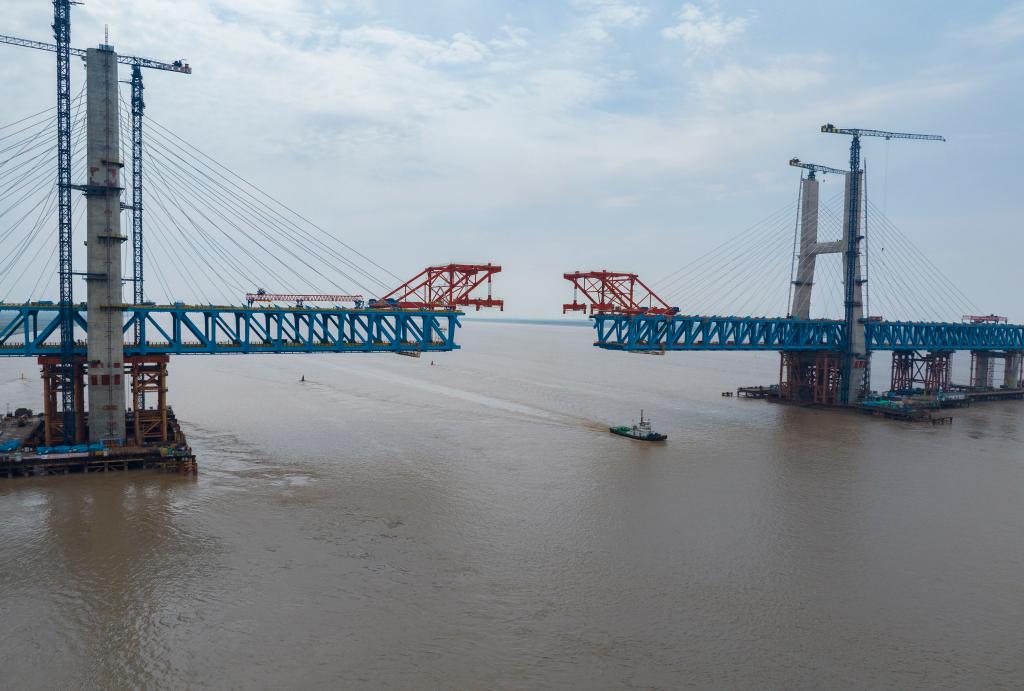 崇启公铁长江大桥是沪渝蓉高铁沪宁段关键控制性工程,全长4.09公里,横跨长江入海口北支航道,采用双层公铁两用无砟轨道斜拉桥的设计,上层为设计时速100公里的双向六车道一级公路,下层为设计时速350公里的双线高速铁路及设计时速250公里的双线城际铁路,主通航孔跨径达400米。目前大桥主跨钢梁4个节段等待吊装,预计5月下旬完成大桥合龙。