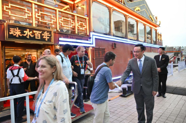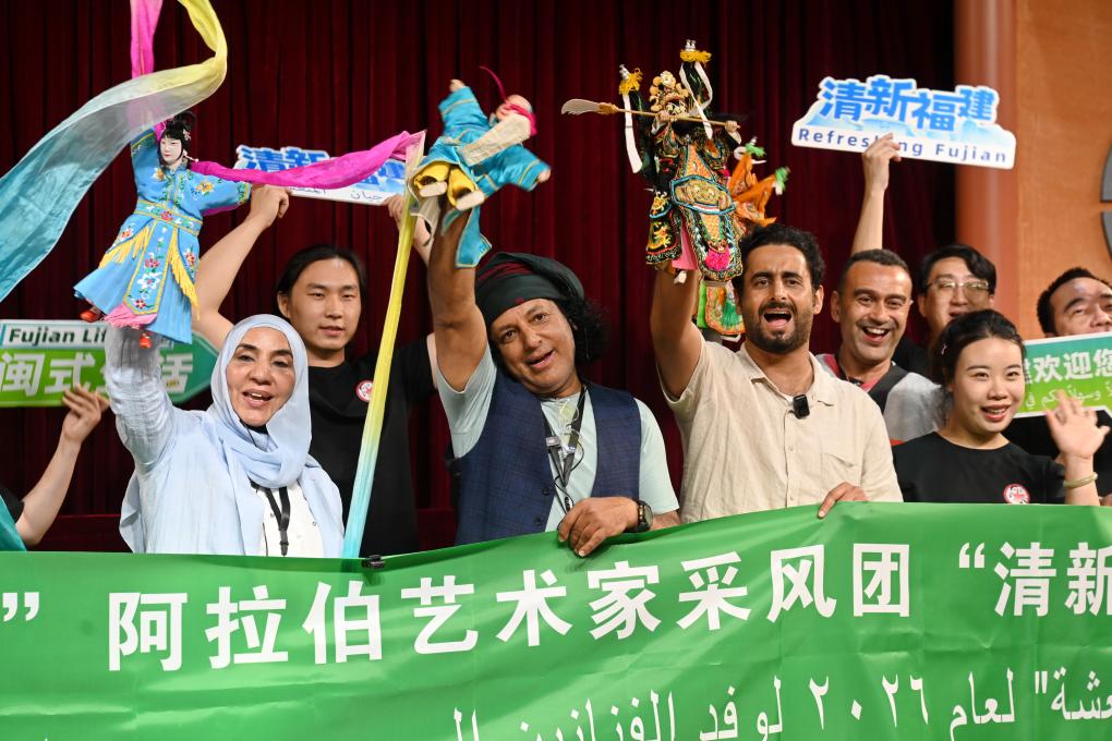 4月16日,来自阿尔及利亚、阿曼、埃及等国的9名阿拉伯艺术家参观福建漳州古城,欣赏漳州布袋木偶戏等非遗项目,感受古城独特韵味。