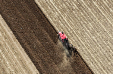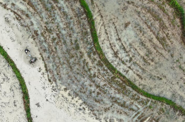 4月18日,湖南省衡阳市衡山县白果镇农民驾驶农机在进行早稻插秧作业(无人机照片)。