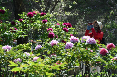 4月19日,游客在湖南省祁东县白地市镇的芍药种植基地打卡游玩。