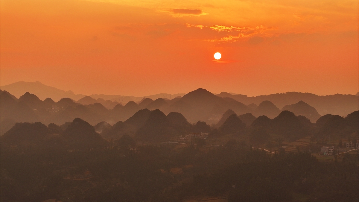 夕阳西下,在云南省昭通市镇雄县银厂村,霞光洒落在乌蒙群山间,航拍视角下,峰峦连绵,山河壮阔,宛如一幅气势恢宏的水墨画卷。