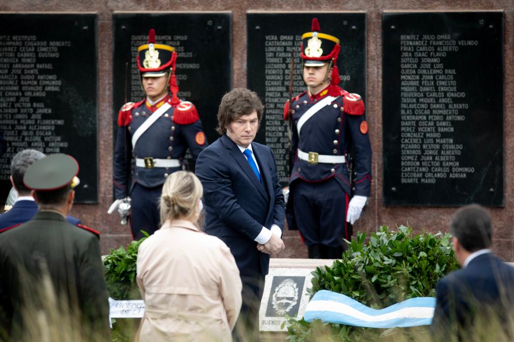 4月2日,阿根廷总统米莱(中)在阿根廷布宜诺斯艾利斯参加纪念马尔维纳斯群岛战争活动。