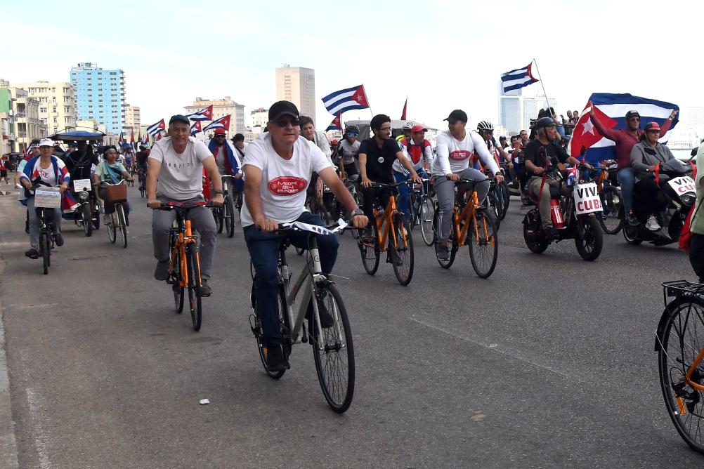 4月2日,民众在古巴哈瓦那海滨大道参加反对帝国主义、捍卫古巴革命的游行活动。