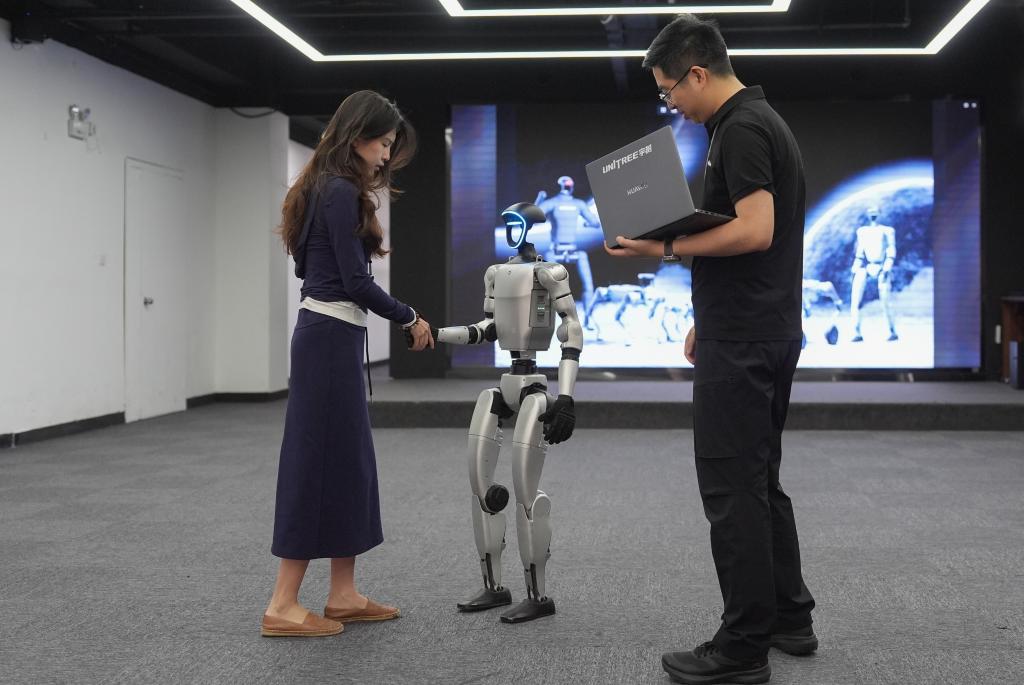 2025年4月23日,在知名机器人公司杭州宇树科技展厅内,宇树人形机器人G1展示握手动作。新华社记者 黄宗治 摄