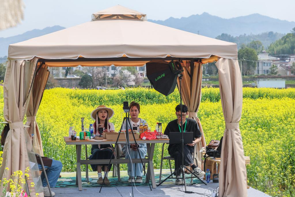 2025年3月23日,主播在浙江省建德市更楼街道城南城市田园油菜花田边的直播间内推介当地文旅项目。新华社记者 徐昱 摄
