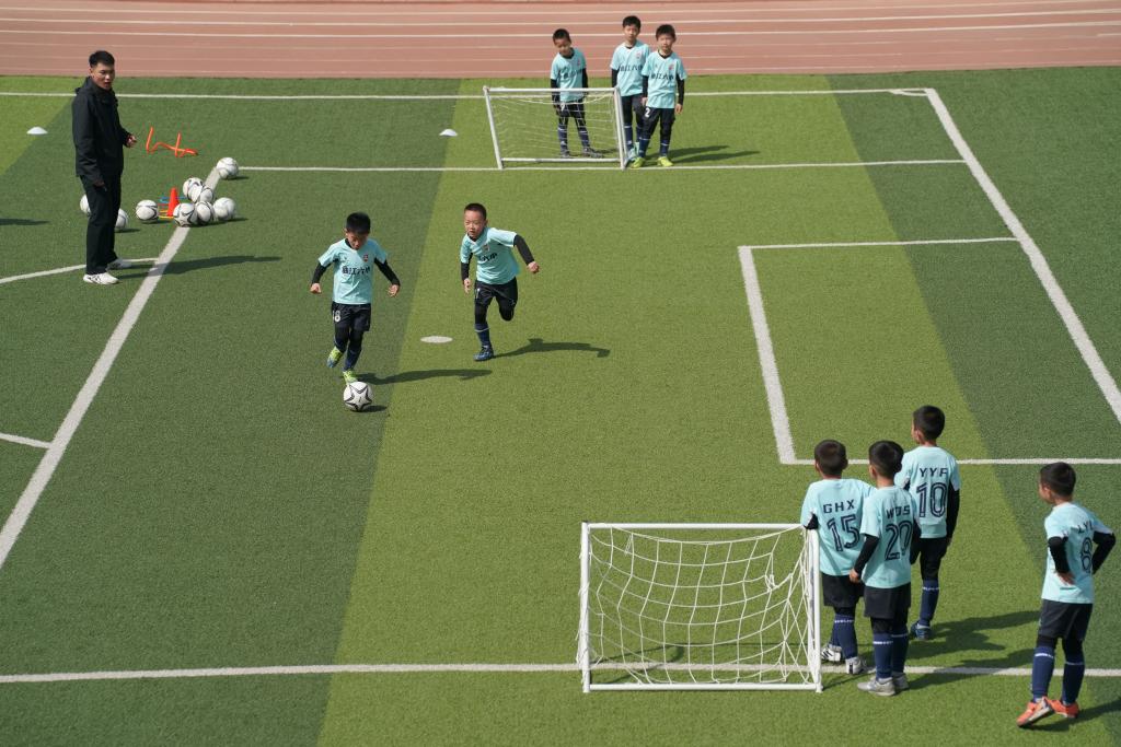 西安市曲江第六小学足球队员在体育课上进行攻防练习。新华社记者 邵瑞 摄