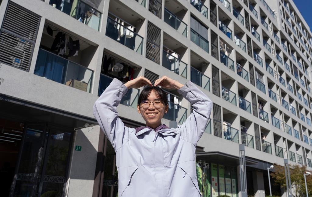 2025年11月13日,在上海的纳仕青年人才社区,南京大学计算机学院的何玉萍在自己居住的“青年驿站”前合影留念,她在上海面试期间申请到了免费住宿。新华社记者才扬 摄